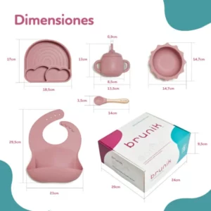 Brunik vajilla bebé de silicona contiene 5 piezas fabricadas en silicona de grado alimenticio 100%, libre de BPA & PVC. No es tóxico para el bebé, sin olores y resistente al agua. Adecuado para -20º – +220º, seguro para microondas, lavavajillas y congelador.