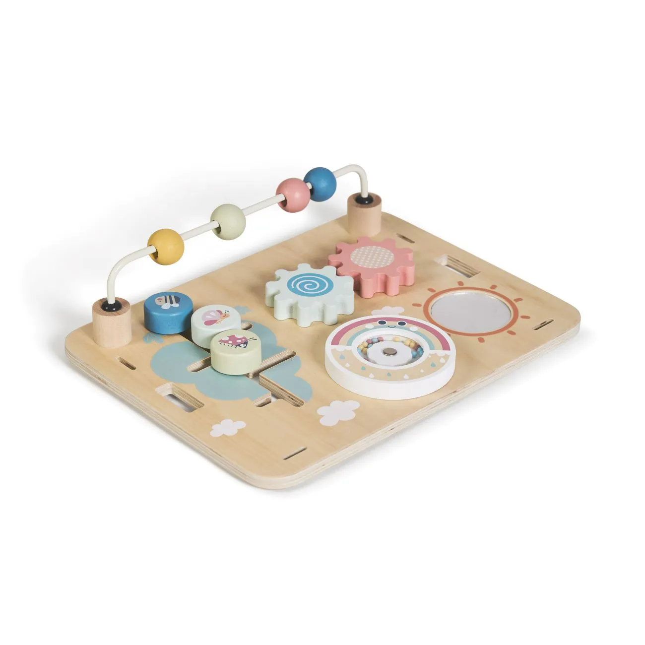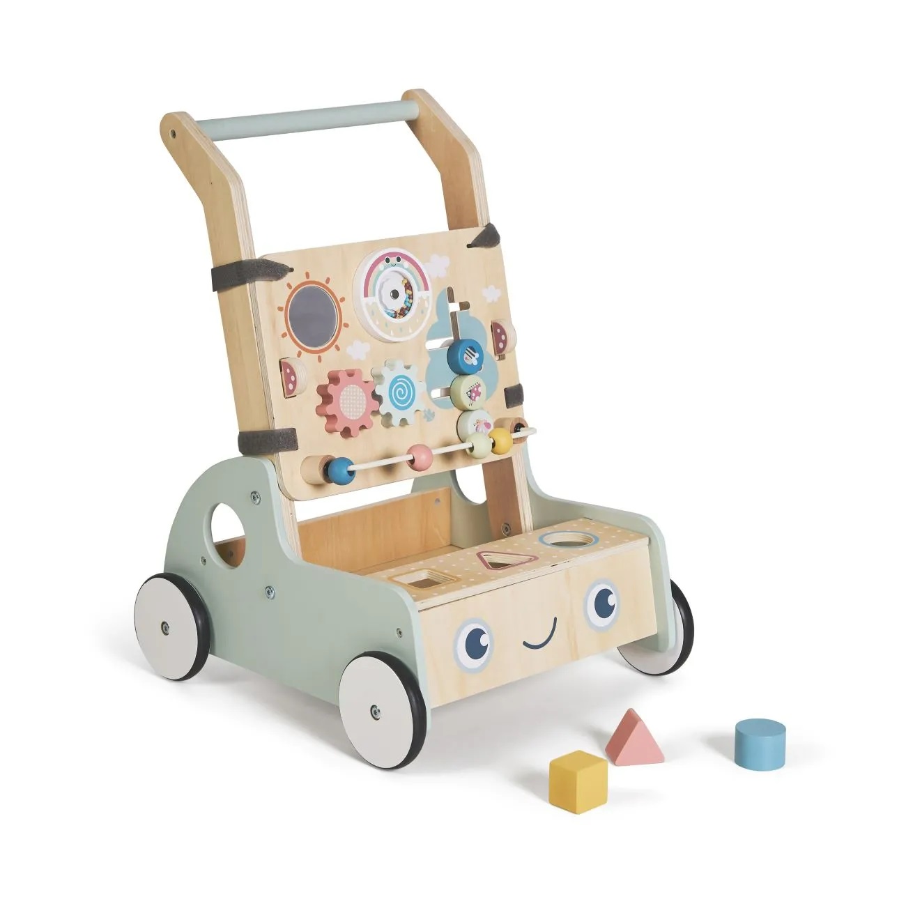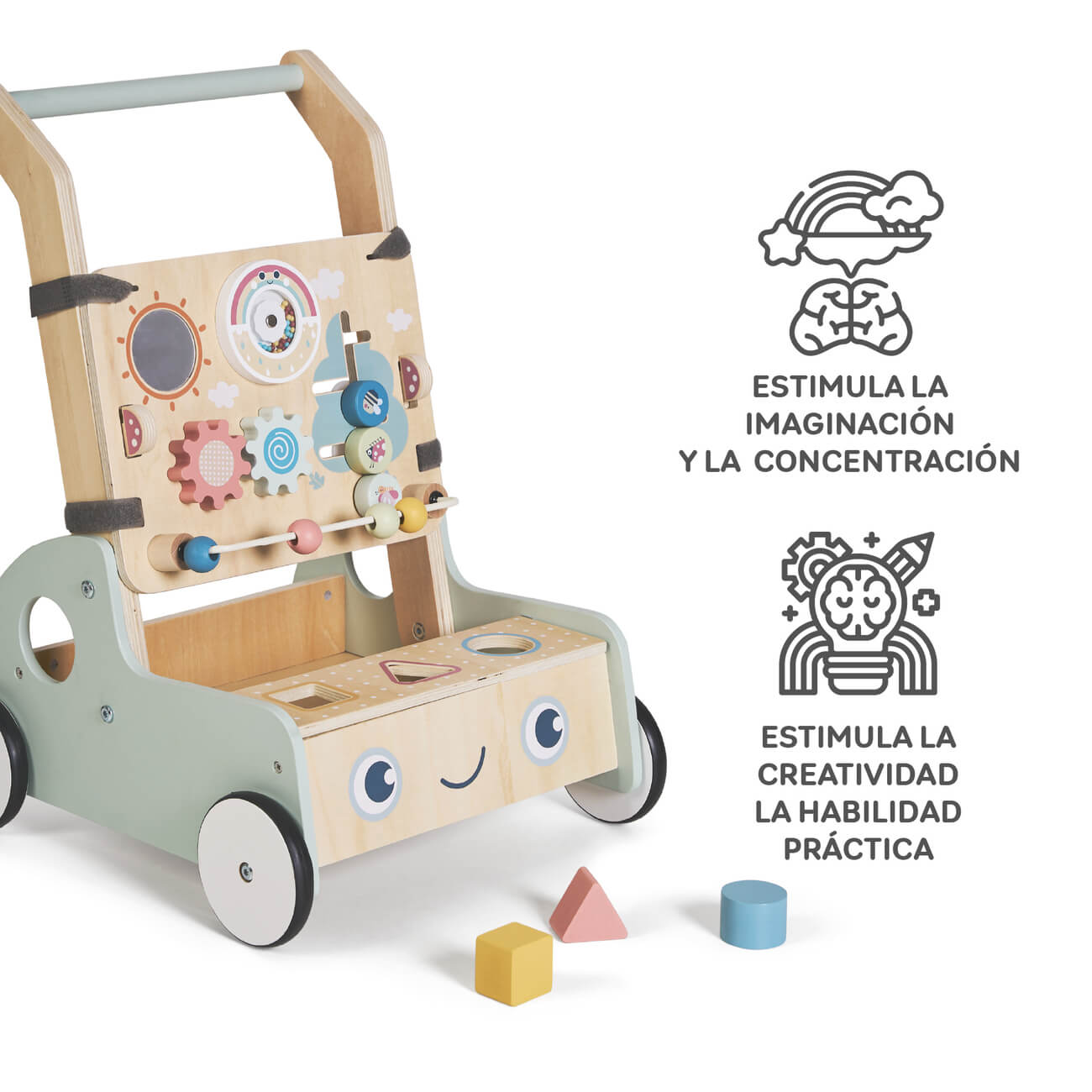 El diseño interactivo de este andador para bebé incluye juguetes sensoriales como puzles de formas, xilófono, espejo giratorio, engranajes, ábaco y bloques de madera. Estos elementos estimulan la coordinación motora, el aprendizaje de colores y formas, y el desarrollo sensorial. ¡Diversión y aprendizaje cada día!