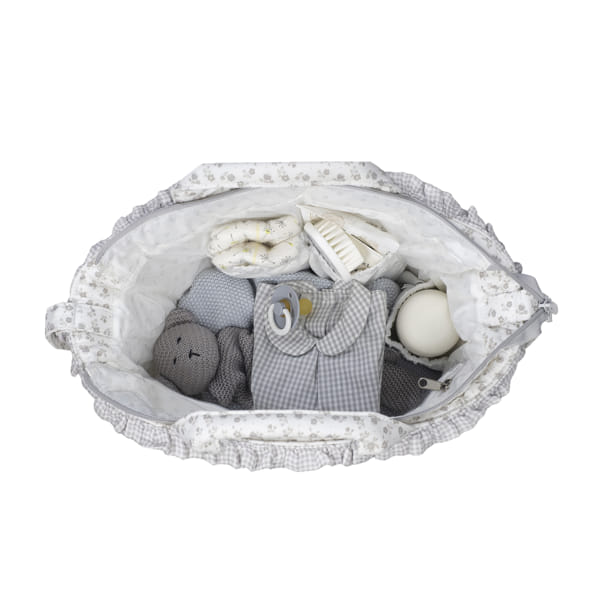 CANASTILLA LITTLE BLOOM FLOR GRIS de Pasito a pasito es un modelo único, elaborado en loneta de algodón 100% con un delicado estampado de flores. Su tratamiento water resistant la hace resistente al agua, garantizando protección y durabilidad en el día a día. Es un diseño muy elegante y práctico que ofrece gran capacidad para que puedas llevar de todo. Viene acondicionado con doble asa, una larga para colgar en el hombro y unas cortas de mano. Incluye asas adicionales universales para colgarla al cochecito. Además, puedes usarla para guardar tus cosas y así evitas llevar dos bolsas al mismo tiempo. Si estás en la dulce espera puedes tenerla preparada como bolsa del bebé para el hospital. Acabados de calidad. La bolsa canastilla de bebé cuenta con un forro interior y bolsillos para colocar de forma organizada el biberón, cubiertos, toallitas, pañales, cremas y cualquier otra cosa que necesite tu hijo. Entre los bolsillos hay un bolsillo térmico para biberones y un bolsillo plastificado para la ropa mojada. Incluye cambiador. Está fabricado con materiales de gran calidad, libres de colorantes azoicos, ftalatos y sustancias nocivas para la salud. Además, se puede lavar a mano o a máquina a temperaturas de hasta 30º. Los productos para bebé de Pasito a Pasito cuentan con un diseño muy diferente a todas las demás. Sus colecciones se caracterizan por el trabajo al detallada, pensadas siempre desde un punto de vista práctico. Utilizan materiales de primera calidad para remarcar la elegancia y la armonía en cada una de sus piezas. Nuestros modelos son exclusivos y de estilo inconfundible, pensados para madres actuales que gozan de buen gusto y que aprecian los detalles tanto como nosotros. Especificaciones: Materiales: 100% algodón. Medidas: 37X30X12 cm.