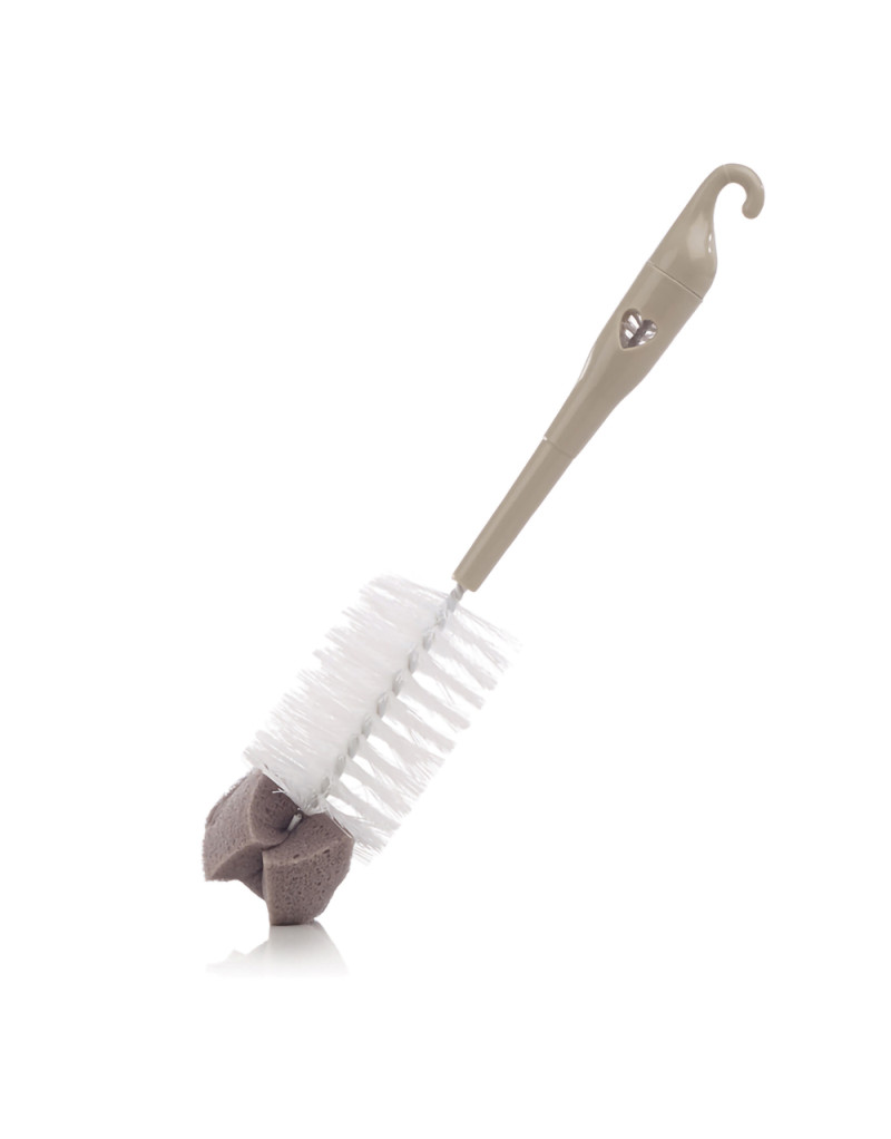 Cepillo de nylon con esponja en el extremo. Fácil limpieza gracias a que es apto para el lavavajillas.