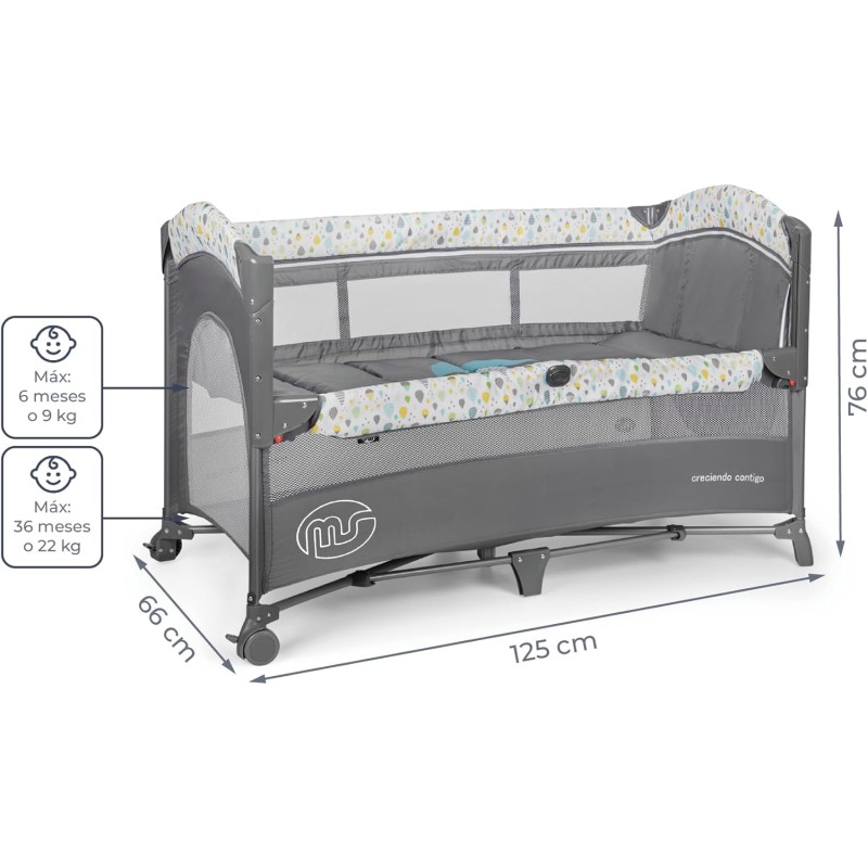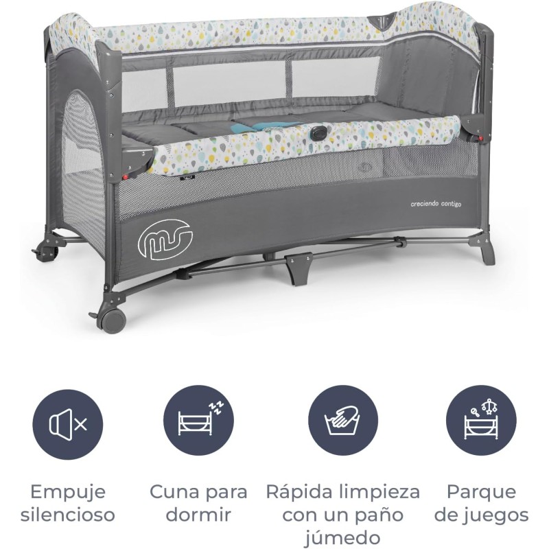Incluye mosquitera para proteger al bebé de insectos, gatera para que juegue, cambiador práctico y bolsa de transporte. El colchón laminado de serie mejora su durabilidad y facilita su limpieza.