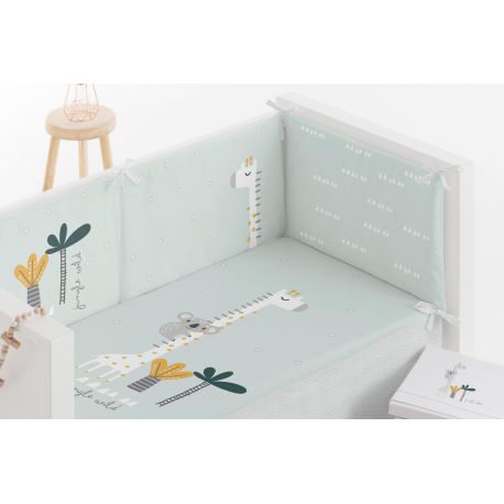 Nuevo modelo KOALA , inlcuye edredon y protector desenfundable para lavarse comodamente, textil 100% algodón. En tonos pasteles color verde menta con dibujos impresos Medida maxicuna 140×70.