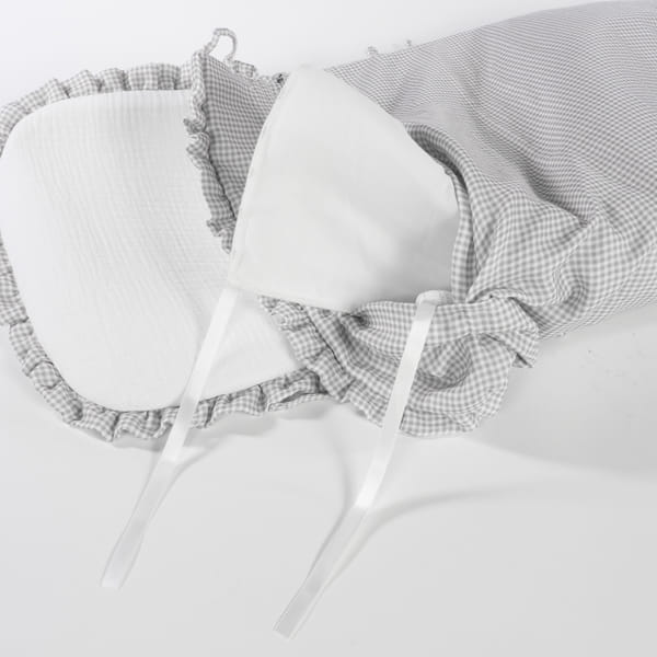 El saco para capazo o cuco Little Bloom VIchy gris de Pasito a Pasito envuelve al bebé en un espacio cálido, suave y confortable desde sus primeros paseos.